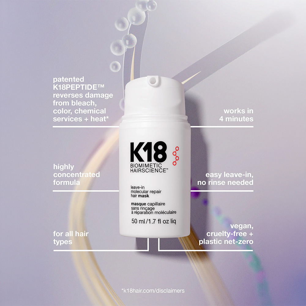 K18 Leave-In Molecular Repair Hair Mask – répare les cheveux abîmés en 4 minutes. Pour des cheveux plus forts, lisses et brillants durablement.