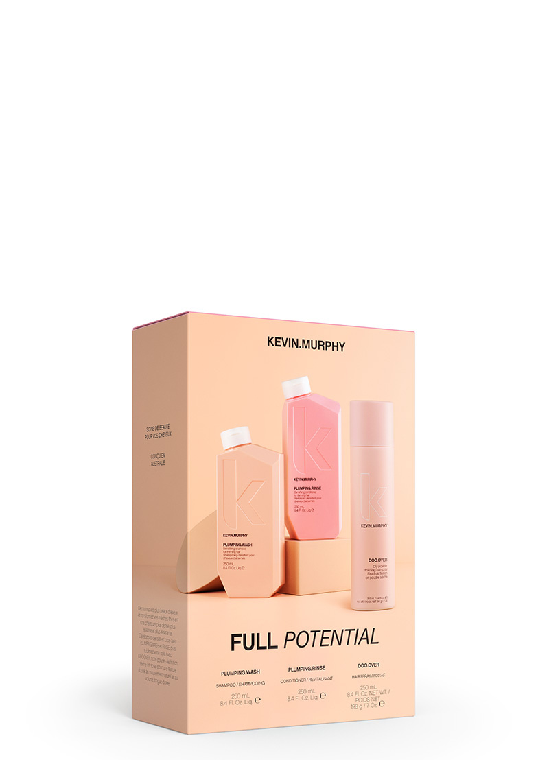 De KEVIN.MURPHY FULL POTENTIAL BOX is een complete volumeboost voor fijn of dunner wordend haar. Deze professionele verzorgingsset combineert PLUMPING.WASH, PLUMPING.RINSE en DOO.OVER om het haar zichtbaar voller, sterker en veerkrachtiger te maken.